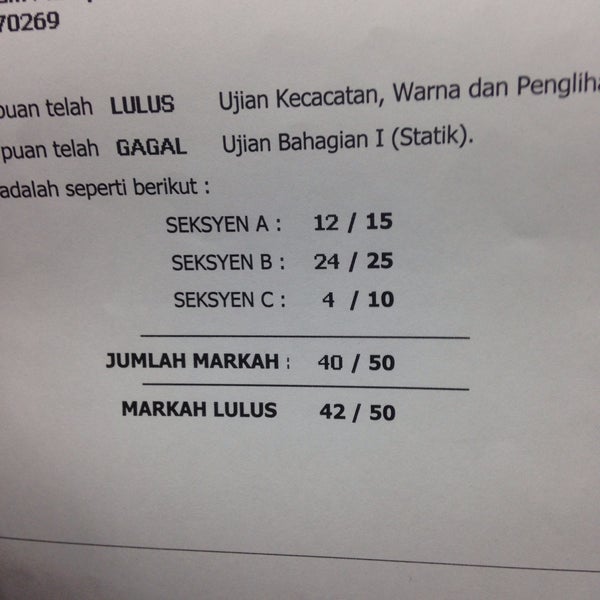 Majistrethakim dan Ketua Pengarah Pengangkutan Jalan 213 adalah lulus ujian teori sekiranya memperolehi sekurang-kurangnya 42 markah daripada 50 markah Malaysia. Untuk soalan lain anda akan menjawab soalan tatabahasa inggeris. Soalan diolah dalam bentuk.